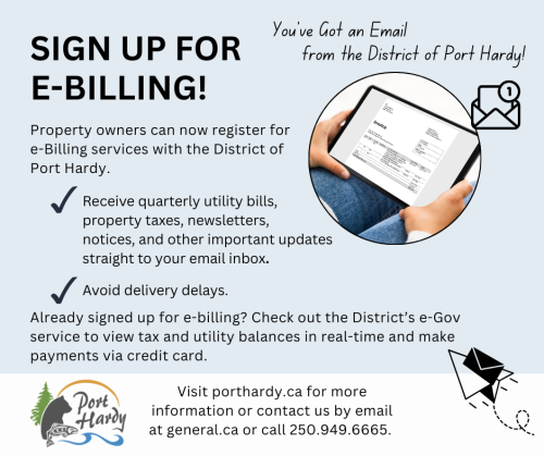 Well it might not be a love note, but it an email you won’t want to miss — or at least we think so! The District of Port Hardy is now offering e-billing services.