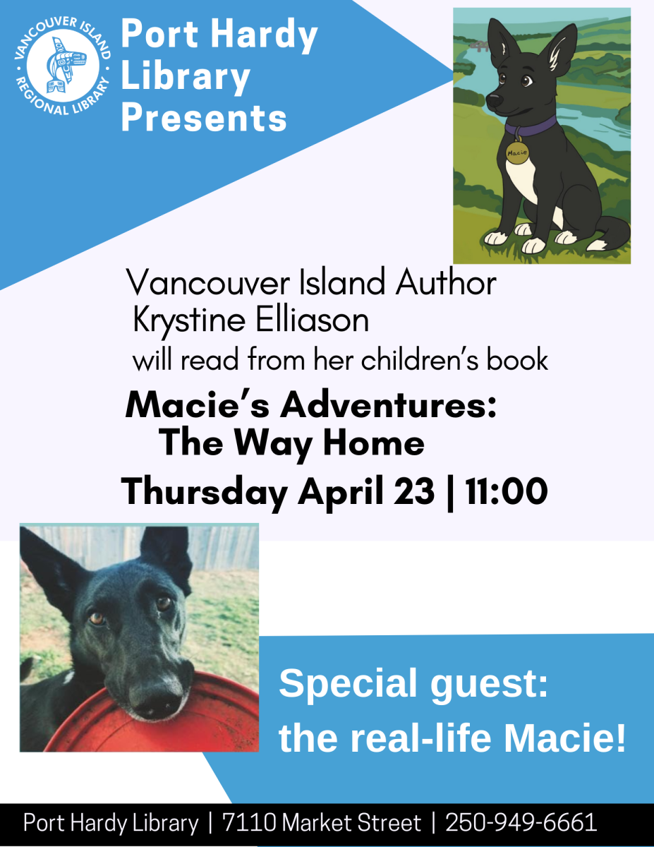 Vancouver Island Author Krystine Elliason will be reading from her children’s book Macie’s Adventures: The Way Home. The VI Regional Library will also be having a special guest: the real-life Macie, service dog extraordinaire!