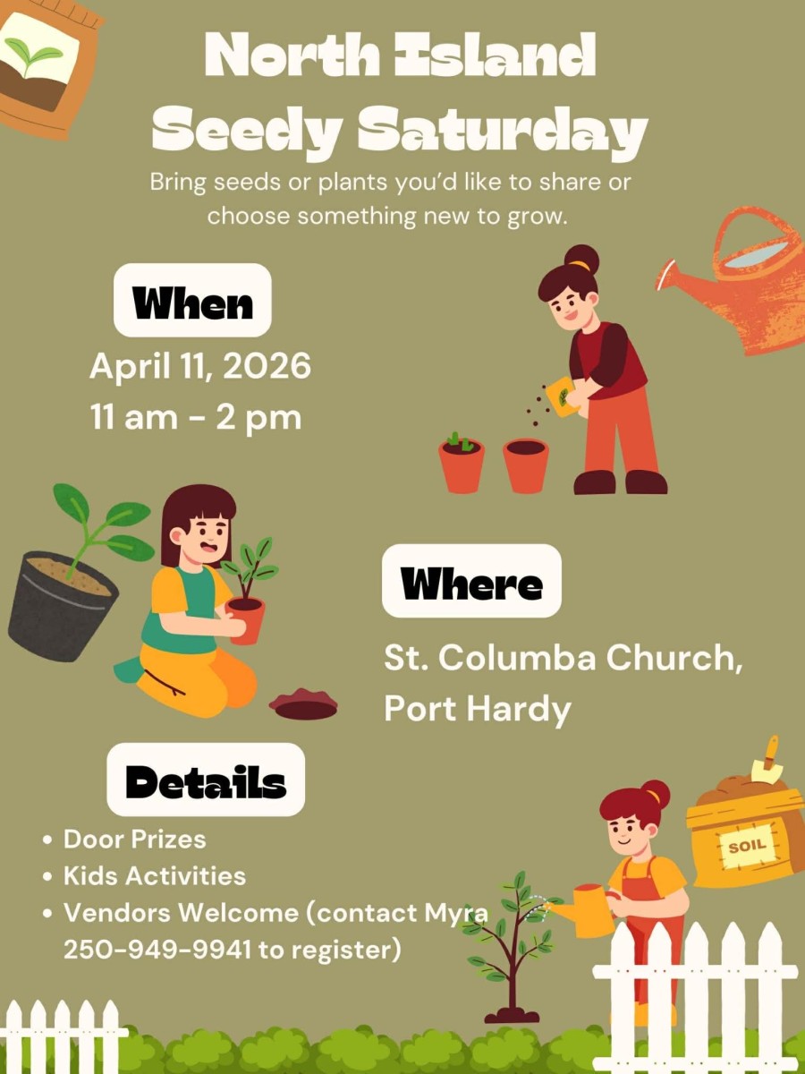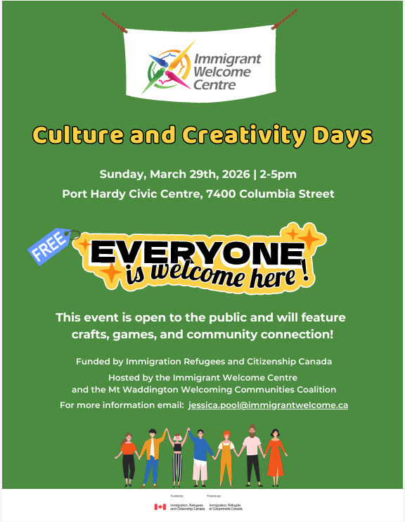 The Immigrant Welcome Centre is hosting its last Culture & Creativity Day of the season on Sunday, March 29! Join them at the Port Hardy Civic Centre from 2-5 pm on the last Sunday of the month for crafts and community connections. For more information, please contact: jessica.pool@immigrantwelcome.ca