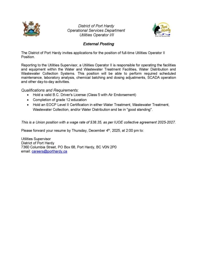 The District of Port Hardy invites applications for the position of full-time Utilities Operator II Position.