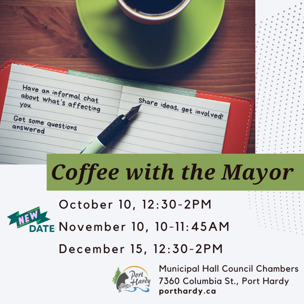 Curious about what happens at Municipal Hall and want to engage with local government and your community? Members of the community are invited to drop by and chat with Mayor about what’s happening in Port Hardy!